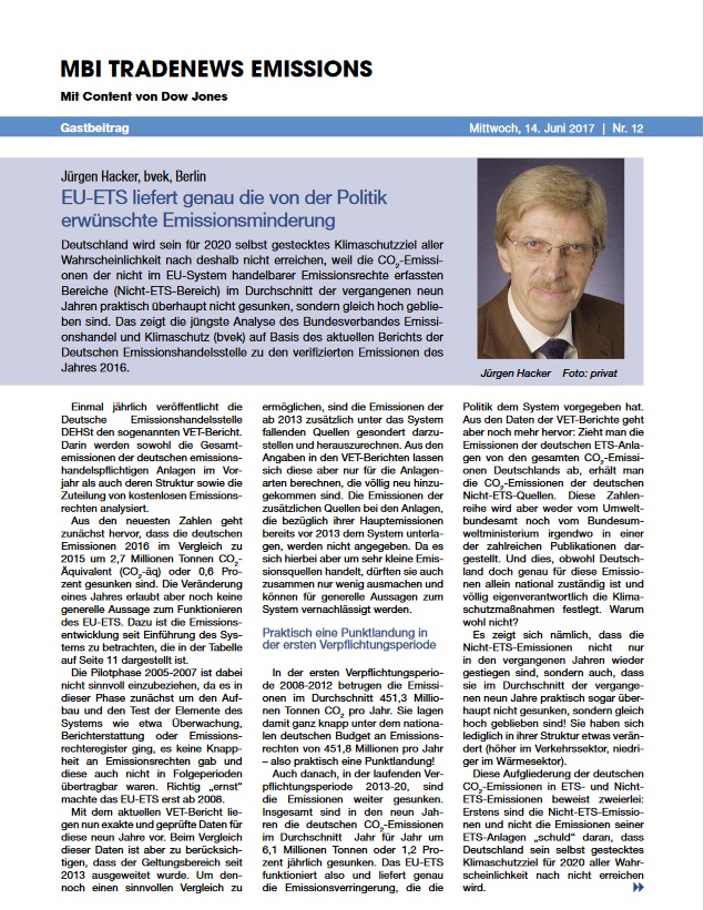 "EU-ETS liefert genau die von der Politik erwünschte Emissionsminderung" Gastbeitrag in "Dow Jones TradeNews Emissions" vom 14. Juni 2017