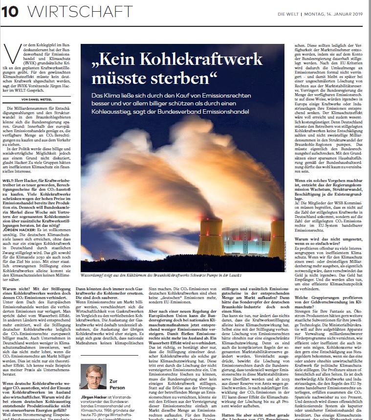 "Kein Kohlekraftwerk müsste sterben" in "DIE WELT" vom 14. Januar 2019