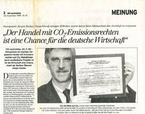 "Der Handel mit CO2-Emissionsrechten ist eine Chance fÜr die deutsche Wirtschaft" in "VDI Nachrichten" vom 20. November 1998